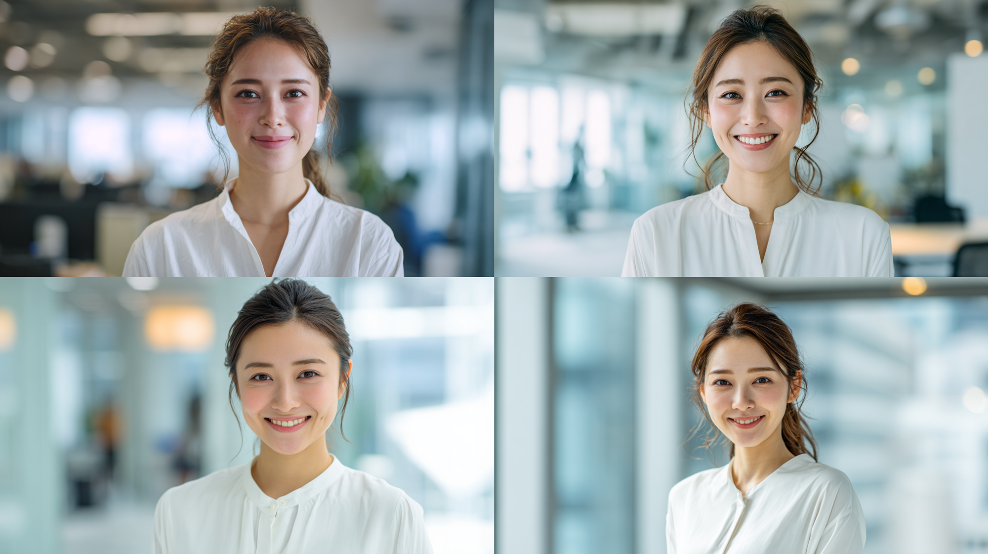 A smiling Japanese business woman in her late 20s to early 30s, looking directly at the camera, wearing a clean white blouse, professional and friendly expression, standing in a modern bright office environment, bokeh background, natural lighting, highly detailed, photorealistic, 8k --ar 16:9 --v 7.0