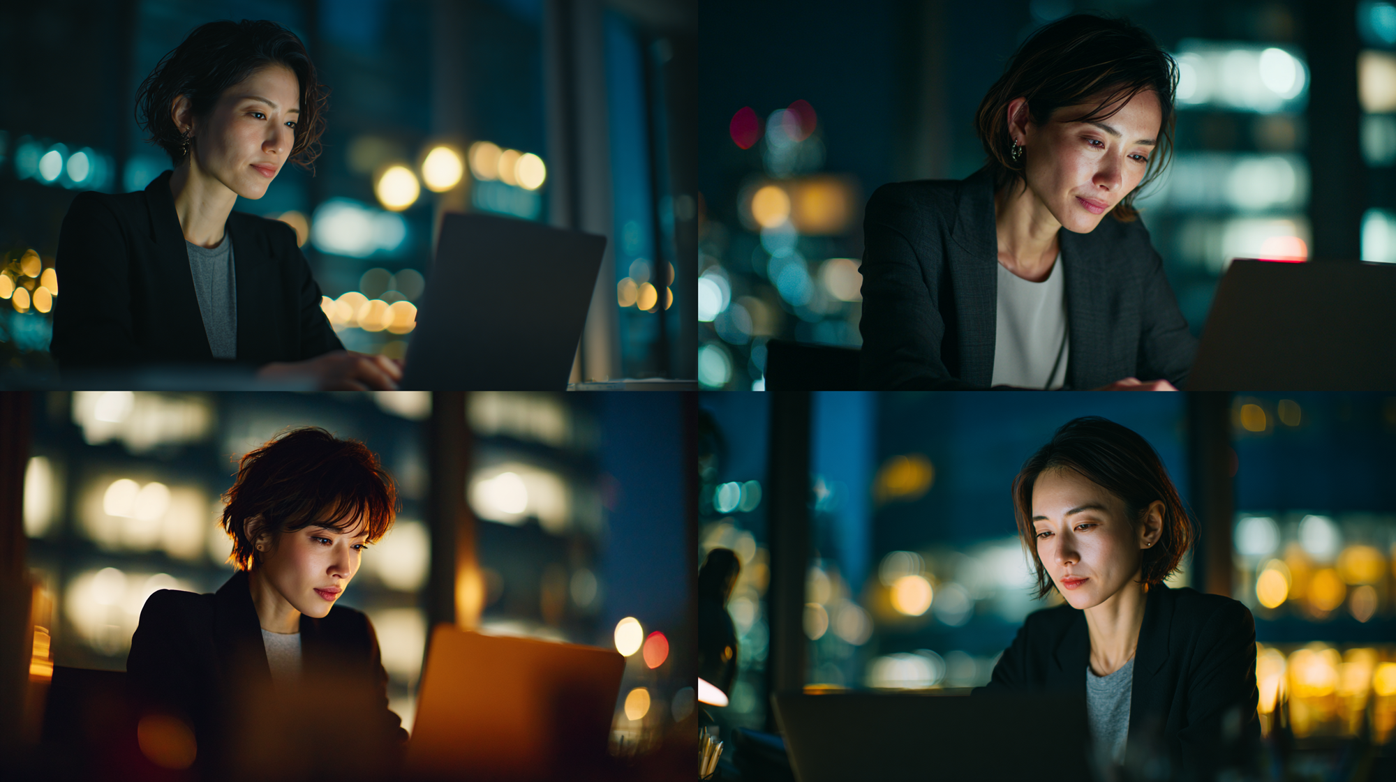 A focused Japanese business woman in her 30s, short hair, typing diligently on a laptop, sitting at a desk in a modern open-plan office, subtle evening city lights in the background, professional and dedicated expression, shallow depth of field, photorealistic, 8k --ar 16:9 --v 7.0