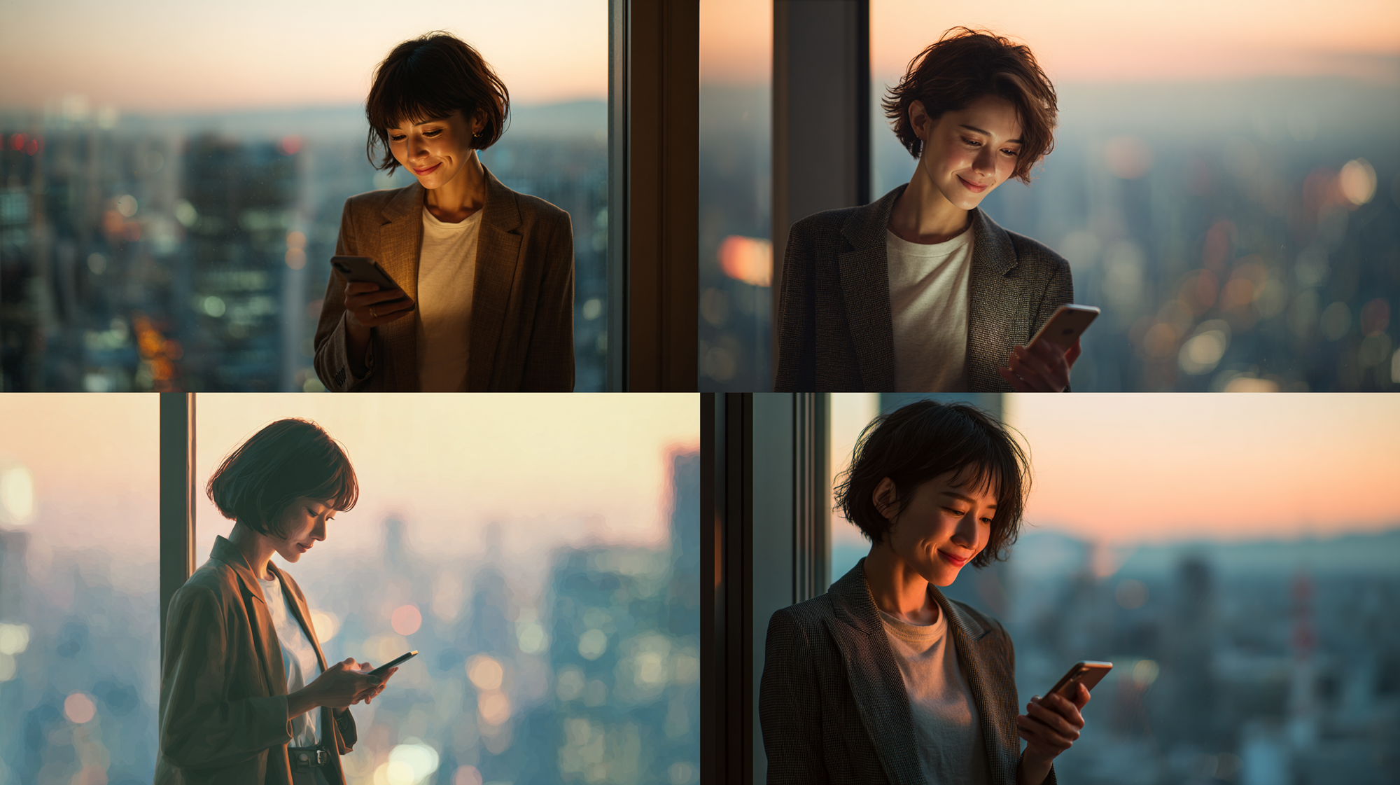A Japanese business woman in her late 20s, short bob hair, casually dressed in a blazer and t-shirt, looking down at her smartphone with a soft smile, standing by a large office window overlooking a blurred Tokyo cityscape at dusk, warm glow from the phone screen, natural and approachable, photorealistic, 8k --ar 16:9 --v 7.0