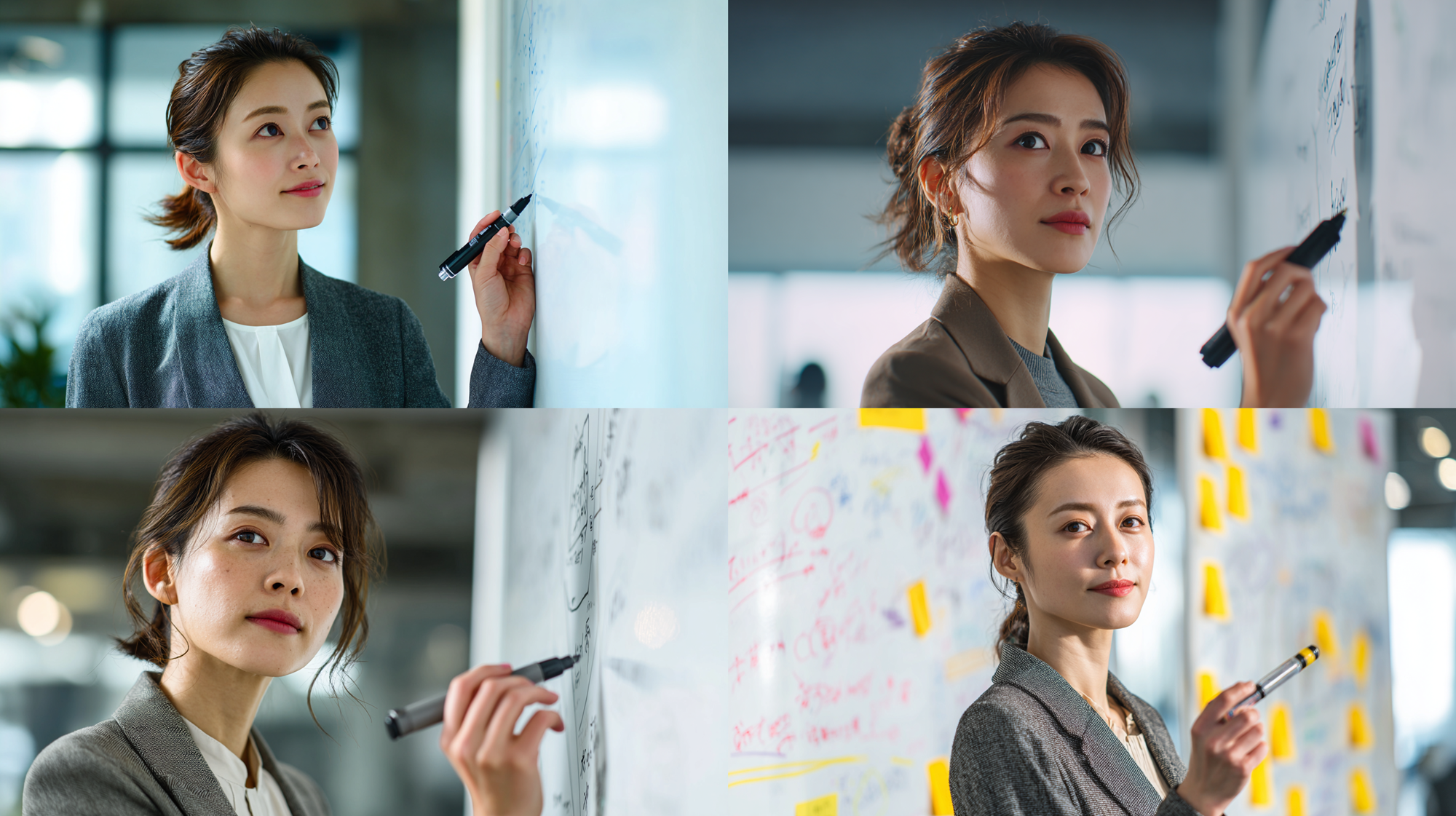 A Japanese business woman in her 30s, short ponytail, wearing a smart casual suit, standing in front of a whiteboard in a bright meeting room, holding a marker pen, thinking and pointing at the board, brainstorming session, professional and creative atmosphere, natural daylight, photorealistic, 8k --ar 16:9 --v 7.0