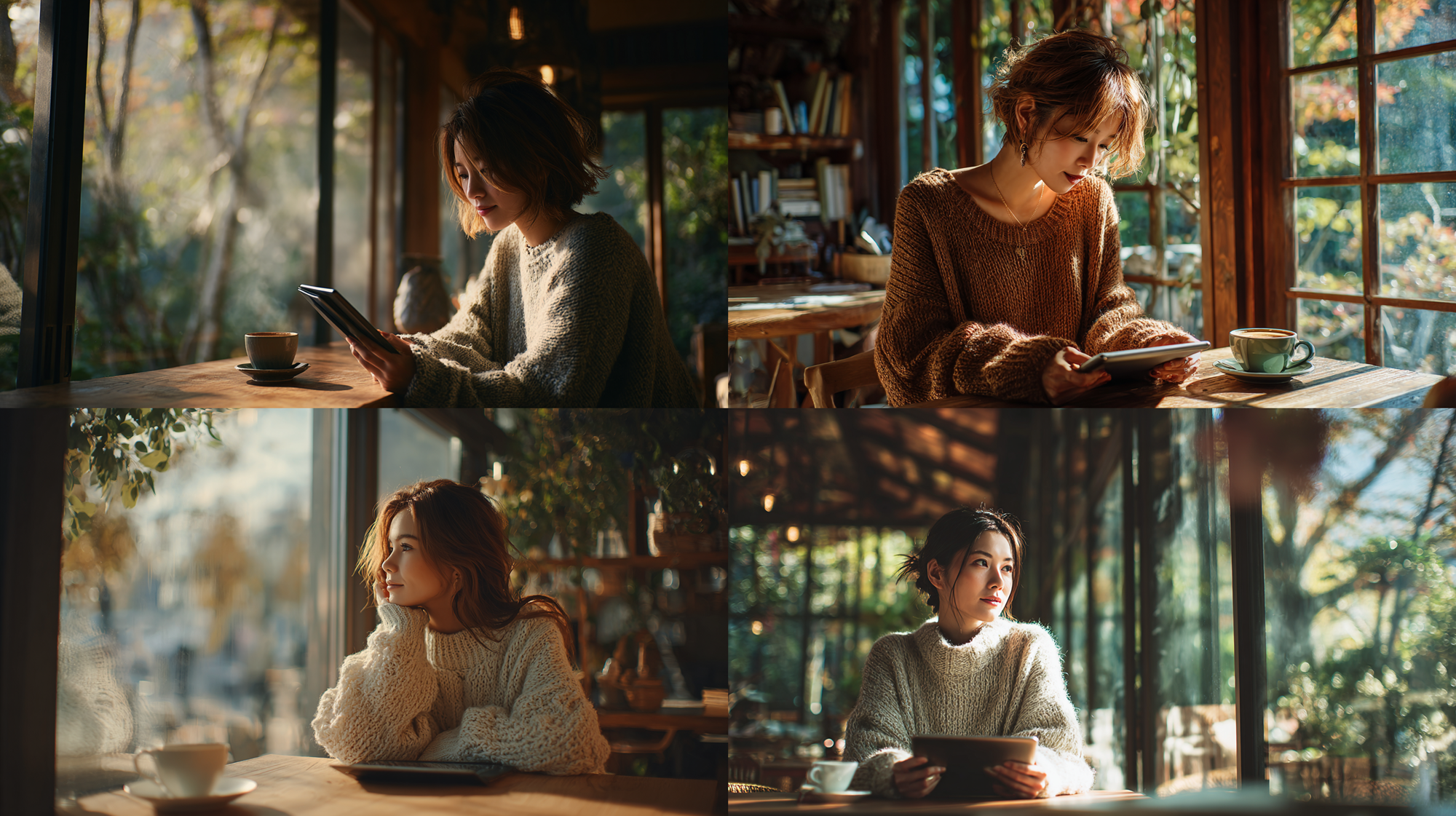 A stylish Japanese woman in her late 20s, wearing a high-quality knit sweater, relaxing at a stylish cafe with large windows, holding a digital tablet, soft sunlight filtering through trees, a cup of coffee on the wooden table, natural and airy atmosphere, high-end lifestyle photography, photorealistic, 8k --ar 16:9 --v 7.0