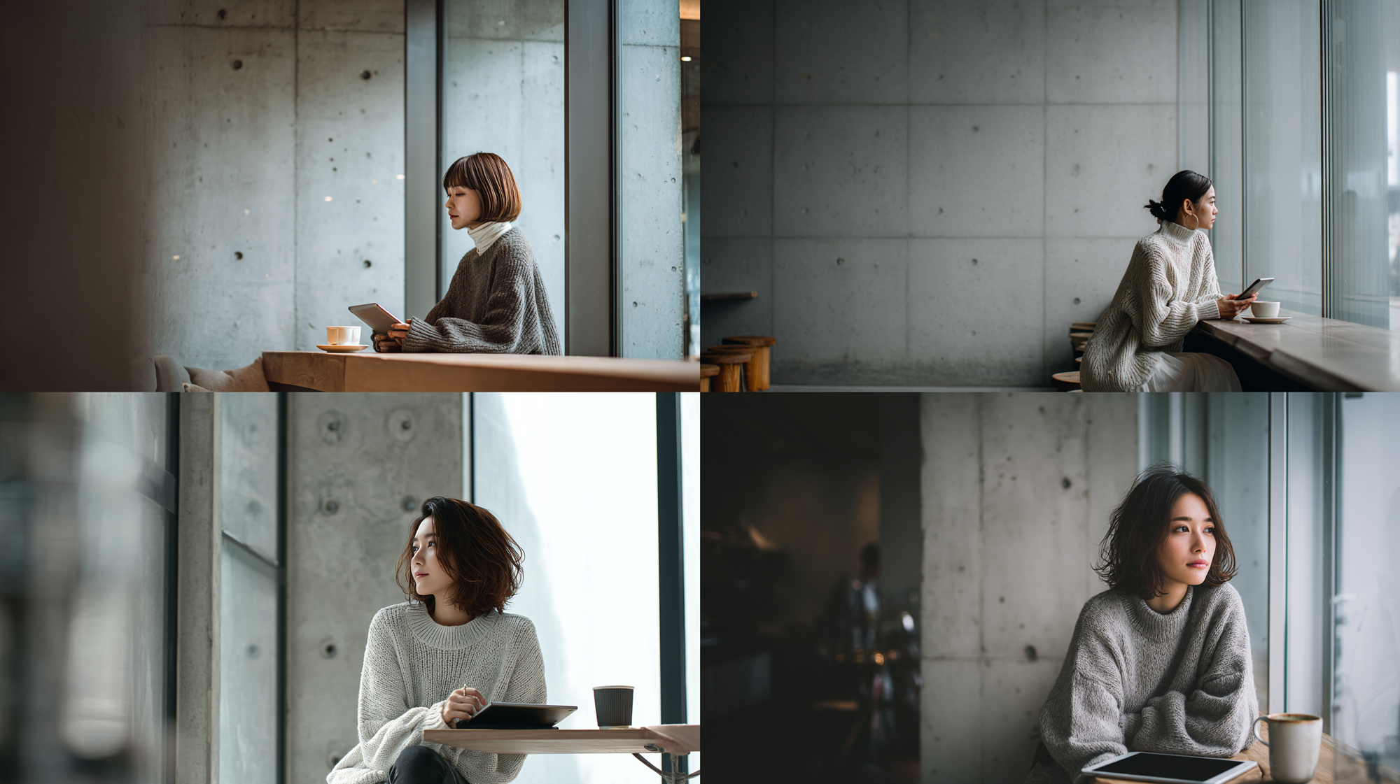A stylish Japanese woman in her late 20s, wearing a high-quality knit sweater, relaxing at aminimalist and inorganic cafe with a clean, industrial design, concrete walls, metal accents, glass surfaces, and a neutral color palette, sitting at a simple table while holding a digital tablet, a cup of coffee placed on a minimal wooden or concrete table, large windows with diffused, neutral daylight, no greenery emphasis, cool and calm atmosphere, quiet and refined mood, modern lifestyle photography, minimalist aesthetic, photorealistic, ultra-detailed, 8k resolution --ar 16:9 --v 7.0